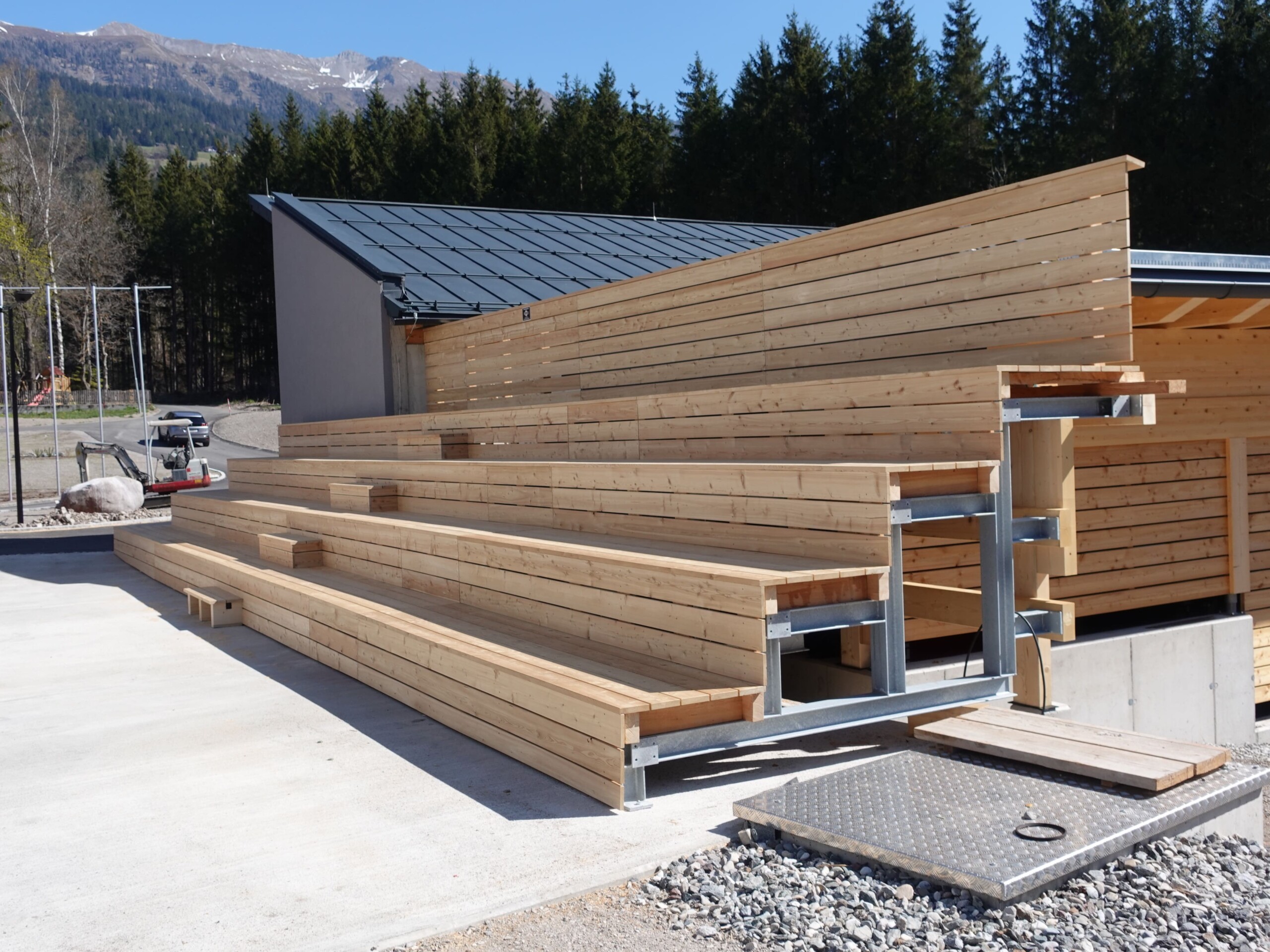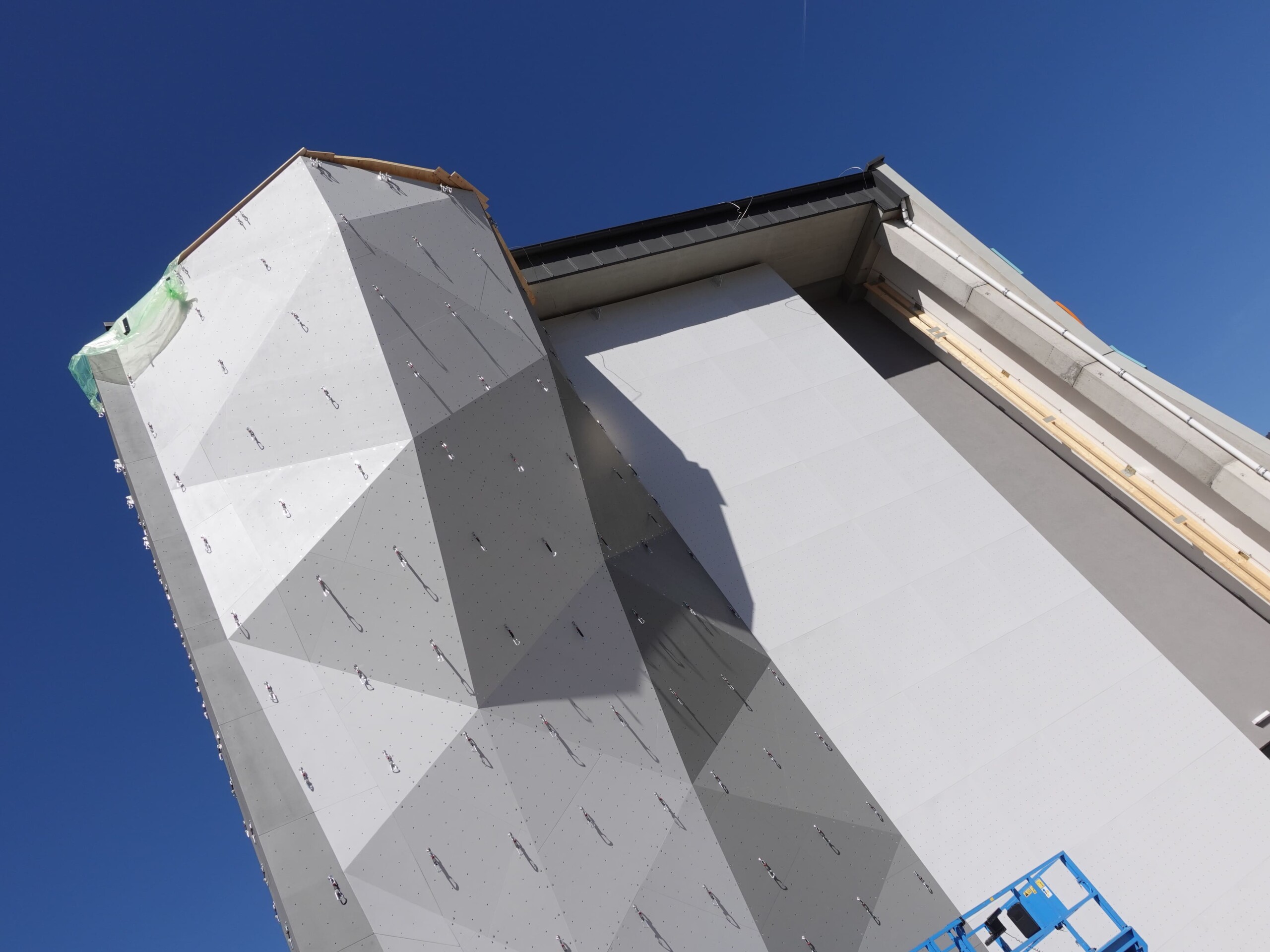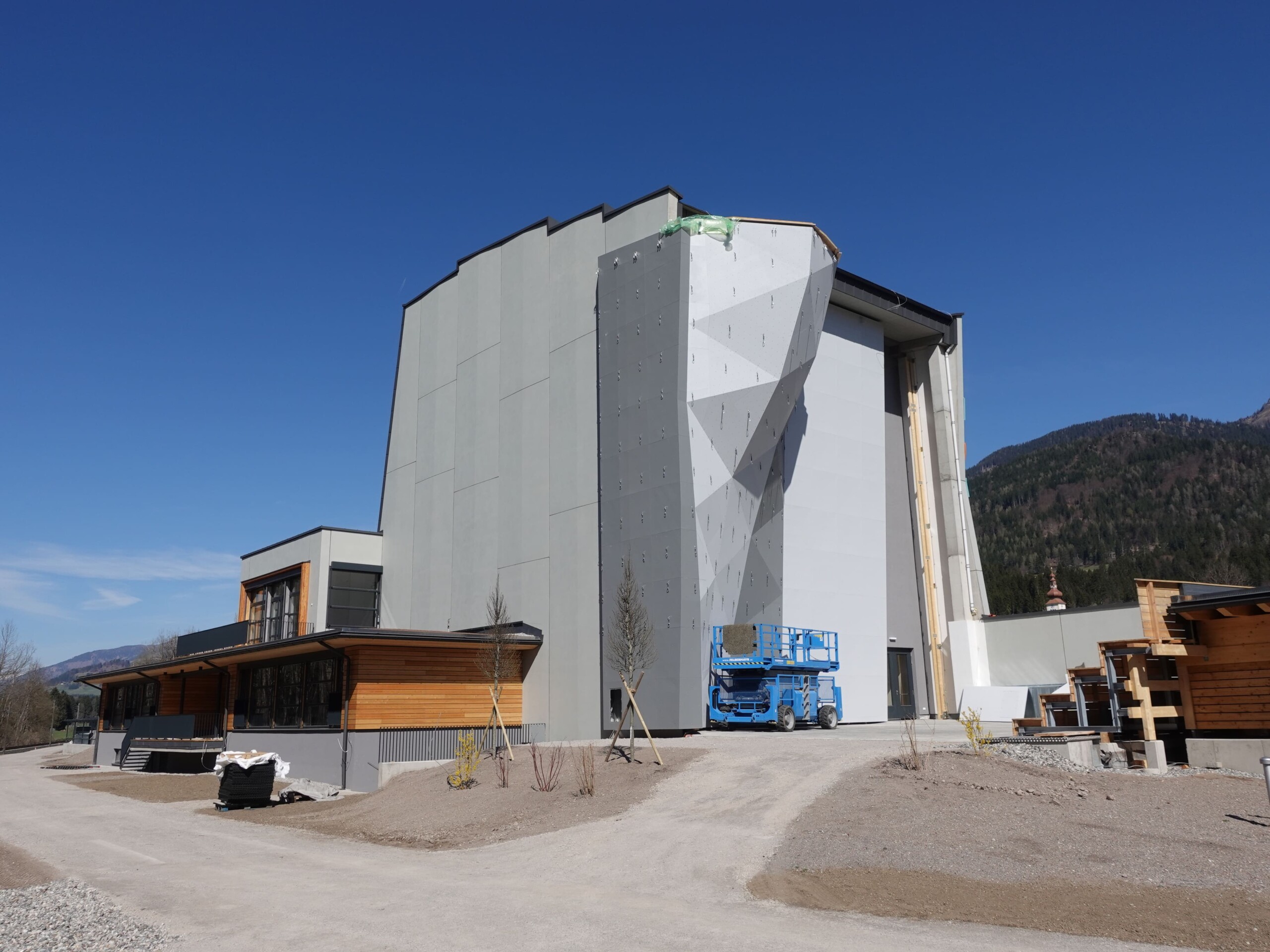 Auch die Gestaltung der Fassade und der Tribüne des Außenkletterturmes unterlag ihrem gekonnten Holzhandwerk. Durch den natürlichen Baustoff Holz – insbesondere durch die Verwendung von Lärchen und Fichtenholz, wurde dem Sportzentrum außen wie innen Wohlfühlatmosphäre verliehen.