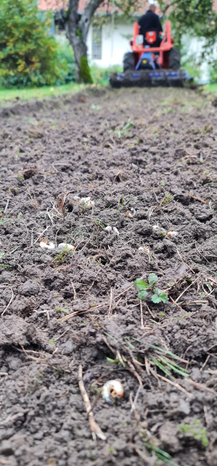 - mit einer Profi-Fräse bearbeiten lassen, dabei wird die oberste Bodenschicht abgetragen, die Käferlarven entfernen und mit Rasensamen neu besäht.