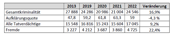 Die Zahl der Anzeigen ist 2022 im Vergleich zum Vorjahr um 16,9 Prozent auf 24.546 Anzeigen angestiegen (2021: 21.004). Damit liegt die Gesamtkriminalität knapp über dem Niveau von 2019, also der Zeit vor der Corona-Pandemie (2019: 24.286). Im Zehnjahresvergleich ist jedoch trotzdem ein Rückgang zu erkennen, 2013 wurden 27.888 Delikte zur Anzeige gebracht.