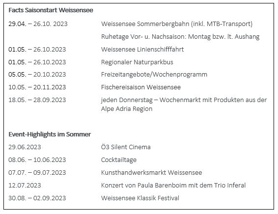 Mit Saisonauftakt am 29. April öffnet die Weissensee Sommerbergbahn als Erste in Kärnten ihre Tore. Besonders MTB-Fans dürfen sich, neben den drei naturbelassenen MTB-Single Trails, auf den kinderfreundlichen Pumptrack und einen lustigen Übungs-parcours an der Bergbahn Talstation freuen. Wanderern bietet der Naturpark neben bewirtschafteten Almen, herrliche Bergpanoramen mit faszinierenden Ausblicken auf das türkisglitzernde Wasser. Ab 01. Mai sticht auch die Weissensee Schifffahrt in See.