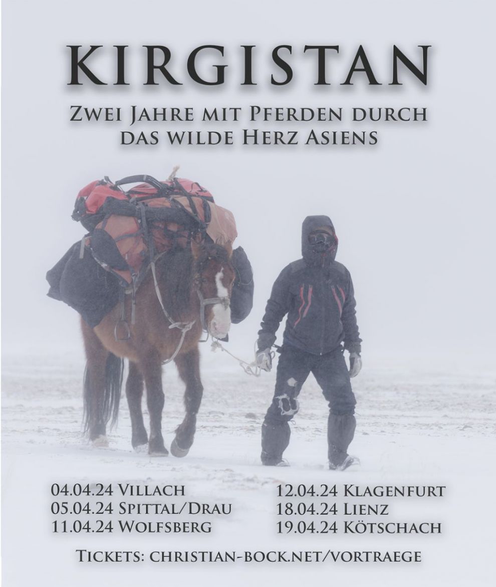 Obwohl er zu diesem Zeitpunkt noch nicht einmal reiten kann und keine Erfahrung mit den Tieren hat, kauft sich Christian Bock auf einem Viehmarkt in Kirgistan sein erstes eigenes Pferd. Er belädt es mit Ausrüstung und Proviant und durchstreift mit dem Zügel in der Hand mehrere Monate die wildesten Teile des Hochgebirgslandes zwischen Kasachstan und China. Diese Art des Reisens fasziniert ihn so sehr, dass er schon bald darauf nach Kirgistan zurückkehrt. Mittlerweile war er insgesamt zwei Jahre mit Pferden in Kirgistan unterwegs. Über fünf Sommer, zwei Winter und mehr als 5000 km Wegstrecke, die er teils allein in der Wildnis und teils mit Hirten und Jägern im Hochland verbringt, ist das Land zu seiner zweiten Heimat geworden. In seinem mehrfach preisgekrönten Vortrag mit einzigartigen Bildern erzählt er von dem Verlust seiner Pferde, nicht enden wollenden Schneestürmen und Nächten bei -40°C im Zelt, von Wolfsangriffen und der Freundschaft mit einer Wölfin, von chinesischem Terrorismus und Zusammenstößen mit dem Militär, sowie von der unbeschreiblichen Gastfreundschaft und dem harten Leben der kirgisischen Nomaden tief in den Bergen.