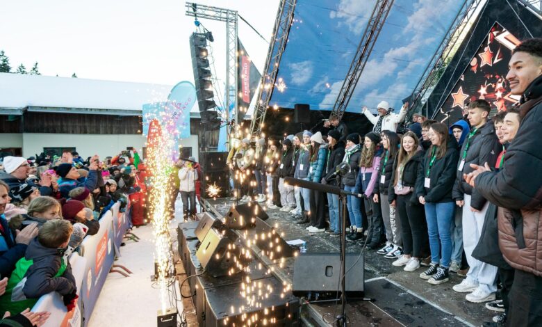 Gerhard „Gerry“ Friedle, alias DJ Ötzi, zeigt Herz und bedankt sich herzlich bei den Schülerinnen und Schülern des BORG Chor Hermagor für die gemeinsame Performance bei der Nassfeld Mountain Winter Party vor rund 2.500 Zuschauern.