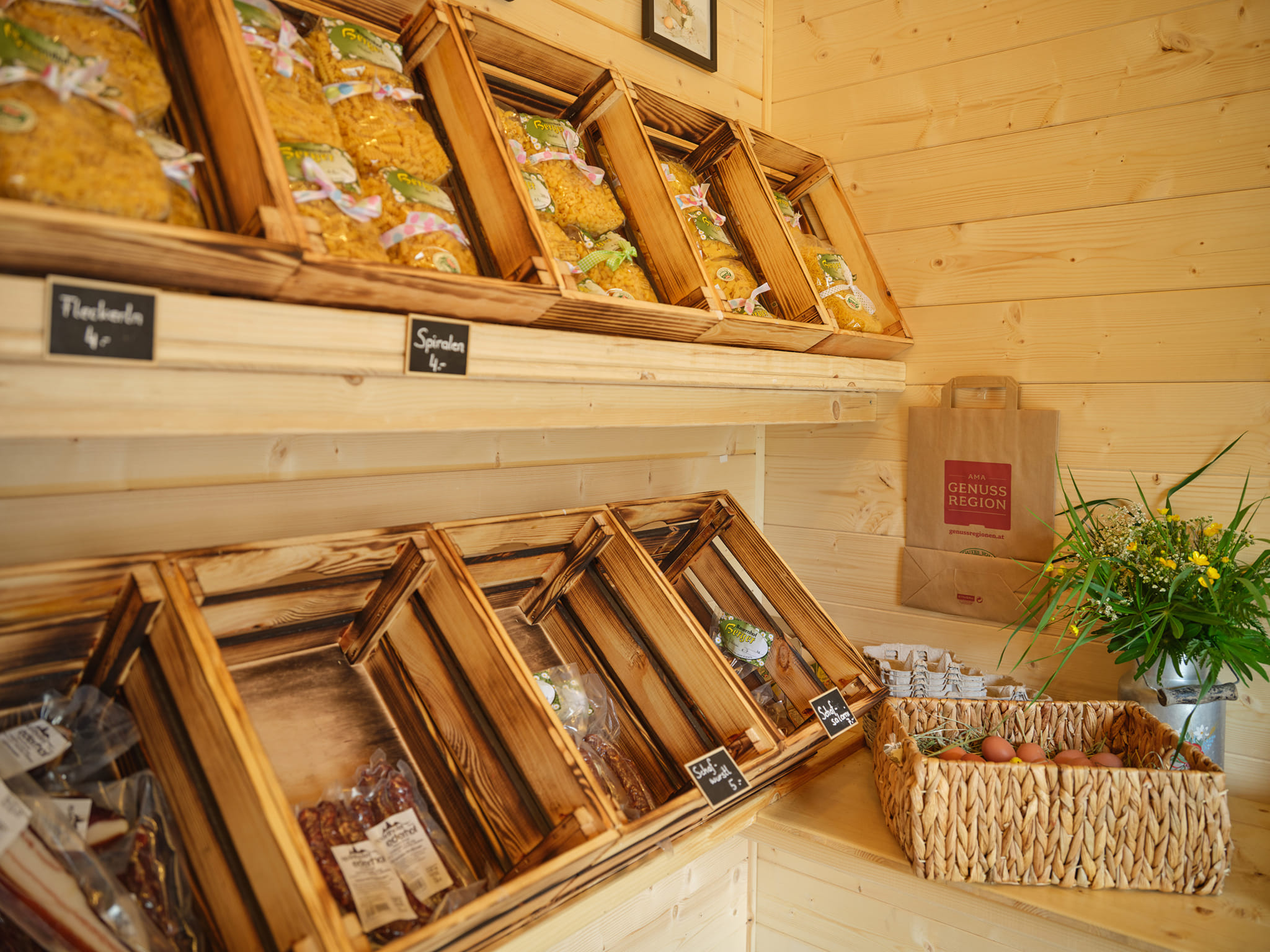 Im kleinen, einladenden Hofladen finden sich weitere Spezialitäten regionaler Partner: Gailtaler Almkäse, herzhafter Speck und würzige Würste aus dem Gailtal, geräucherter Fisch, diverse Milchprodukte, Knoblauch und weitere Schmankerln sowie erfrischende Säfte.