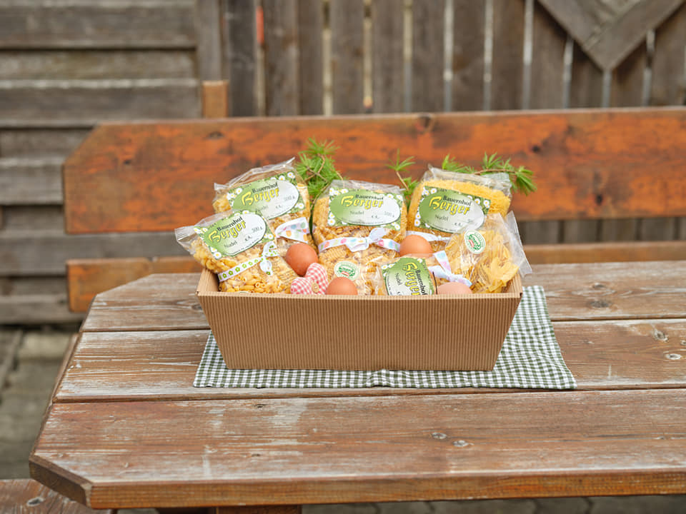 Über 1000 glückliche, artgerecht gehaltene Hennen sorgen für täglich frische Eier, die sowohl verkauft als auch für die hauseigenen Nudeln verwendet werden. Auf ein Kilogramm Hörnchen-Nudeln werden sage und schreibe 7 Eier verarbeitet!
