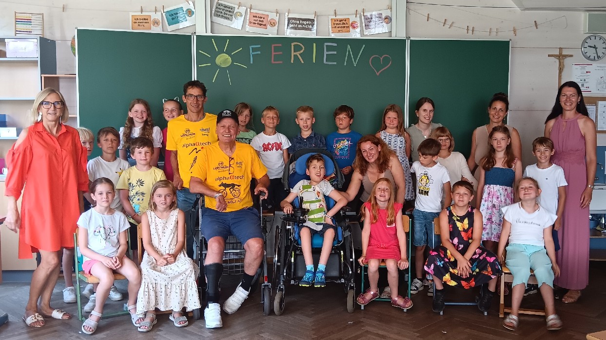 Die beiden Parasportler Wolfgang Dabernig (Radlwolf) und Michael Kurz waren zur Spendenübergabe in der Volksschule Hermagor. Es wurde eine Spende in Höhe von 2,000.-€ zu Gunsten Bendegúz übergeben, der die Krankheit SMA1 (Spinale Muskelatrophie) Typ 1, hat.
